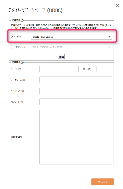 「その他のデータベース(ODBC)」設定ウィンドウが開いたら、接続手段内のDSNから「CData REST Source」を選択して「サインイン」します。