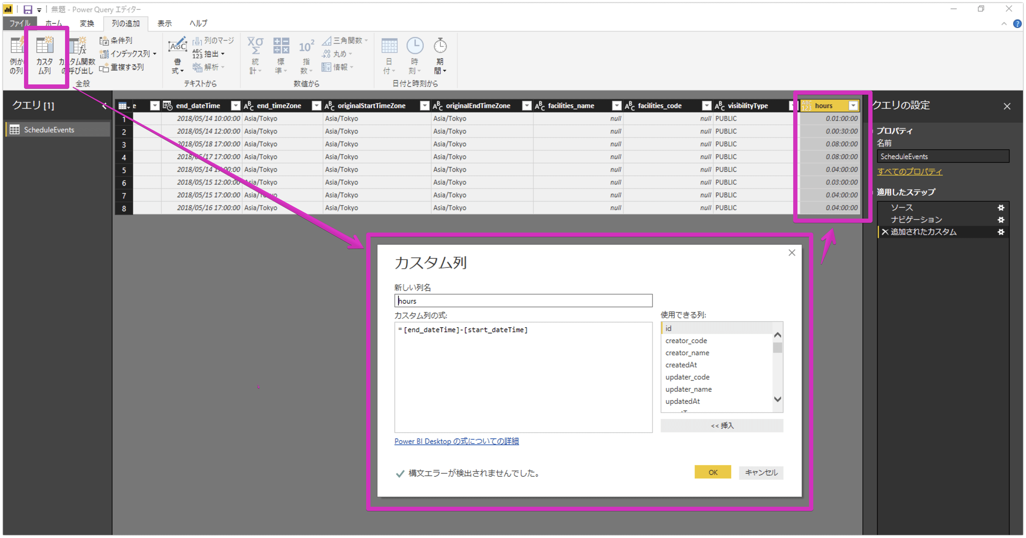 以下のカスタム列を追加して適用してクエリ編集を閉じます。