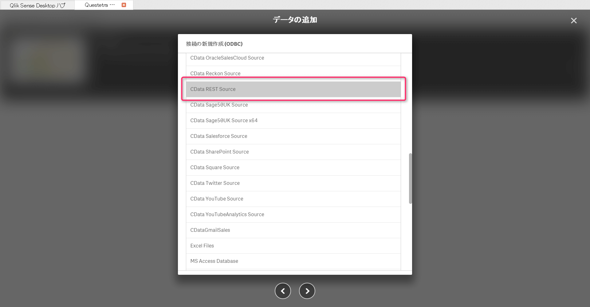 「Data source name(DSN)」で「CData REST Source」を選択します。