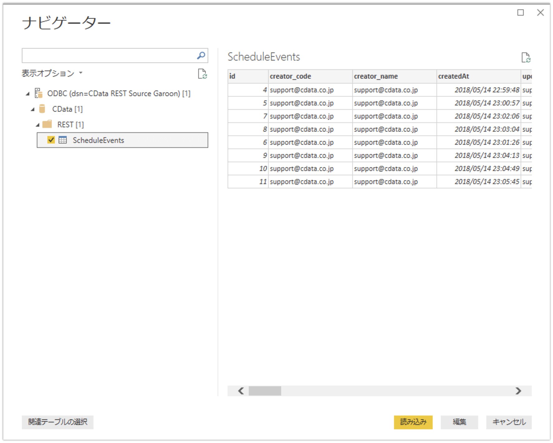 「Navigator」にてテーブル「ScheduleEvents」を選択してデータプレビューにGaroonの自身のスケジュール一覧が表示されることを確認します。