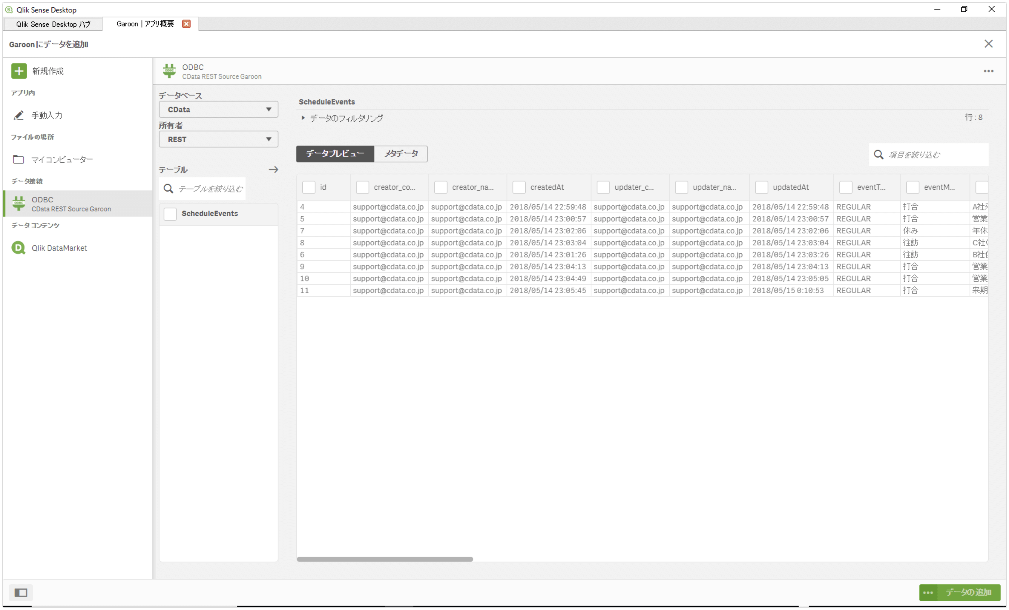 テーブル「ScheduleEvents」を選択してデータプレビューにGaroonの自身のスケジュール一覧が表示されることを確認します。