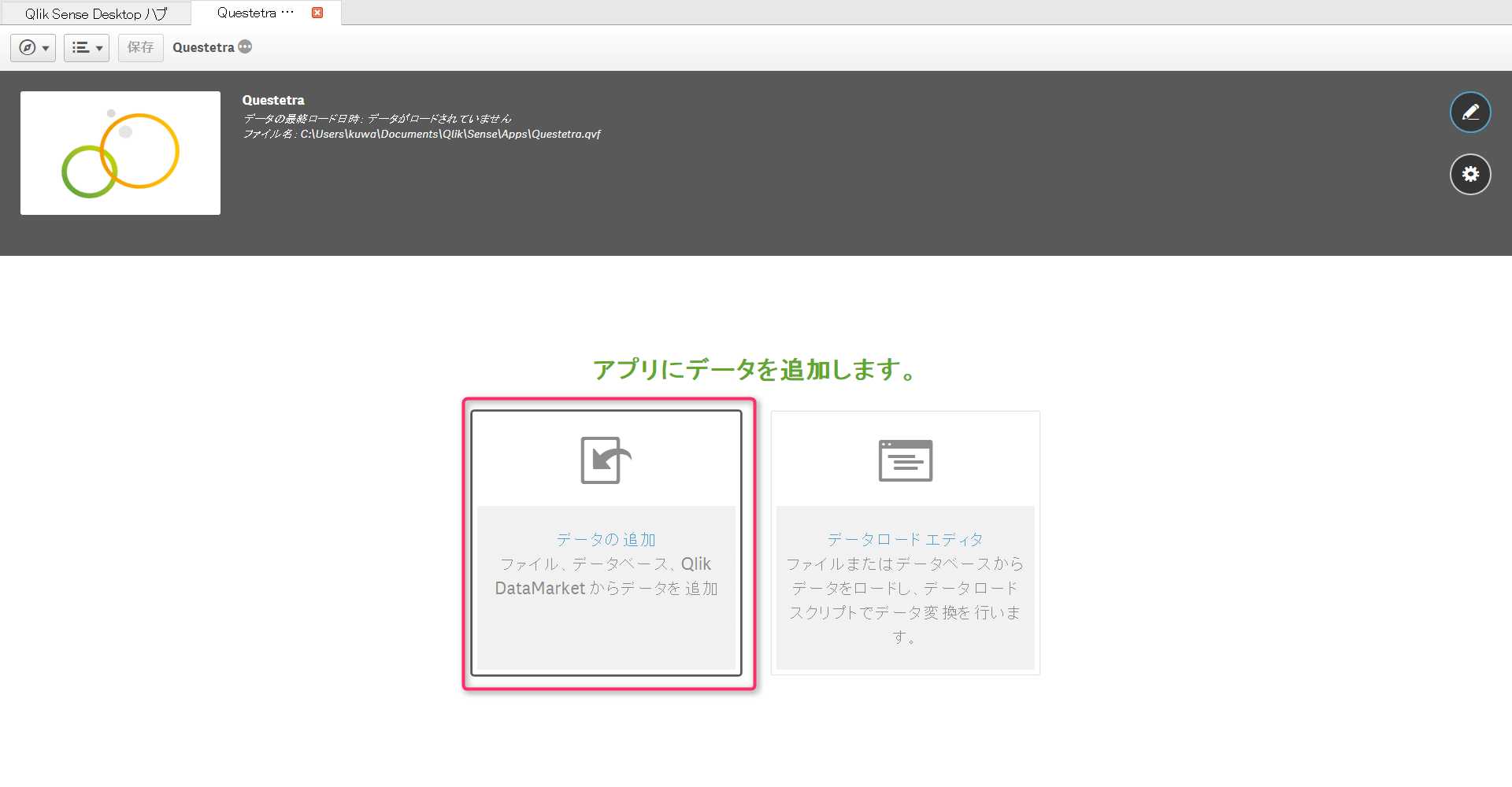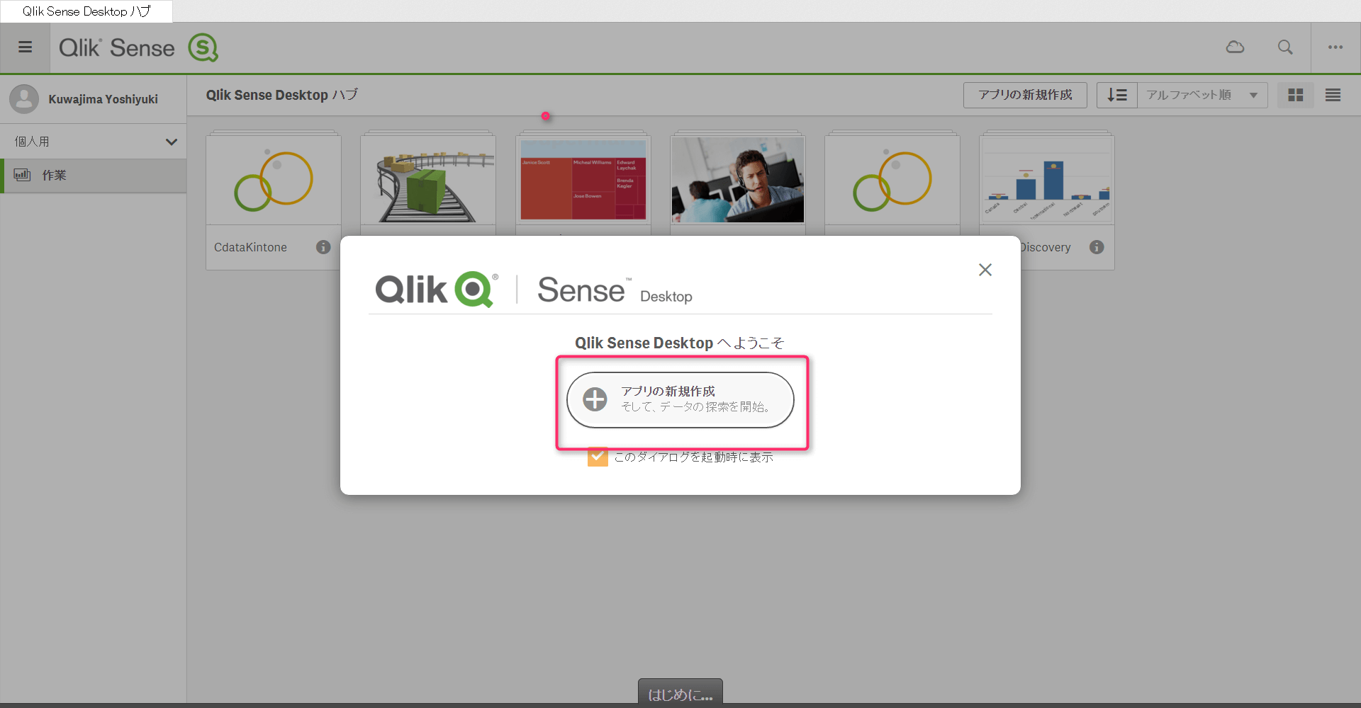 QlikSence Desktopを起動して、「アプリの新規作成」をクリックします。