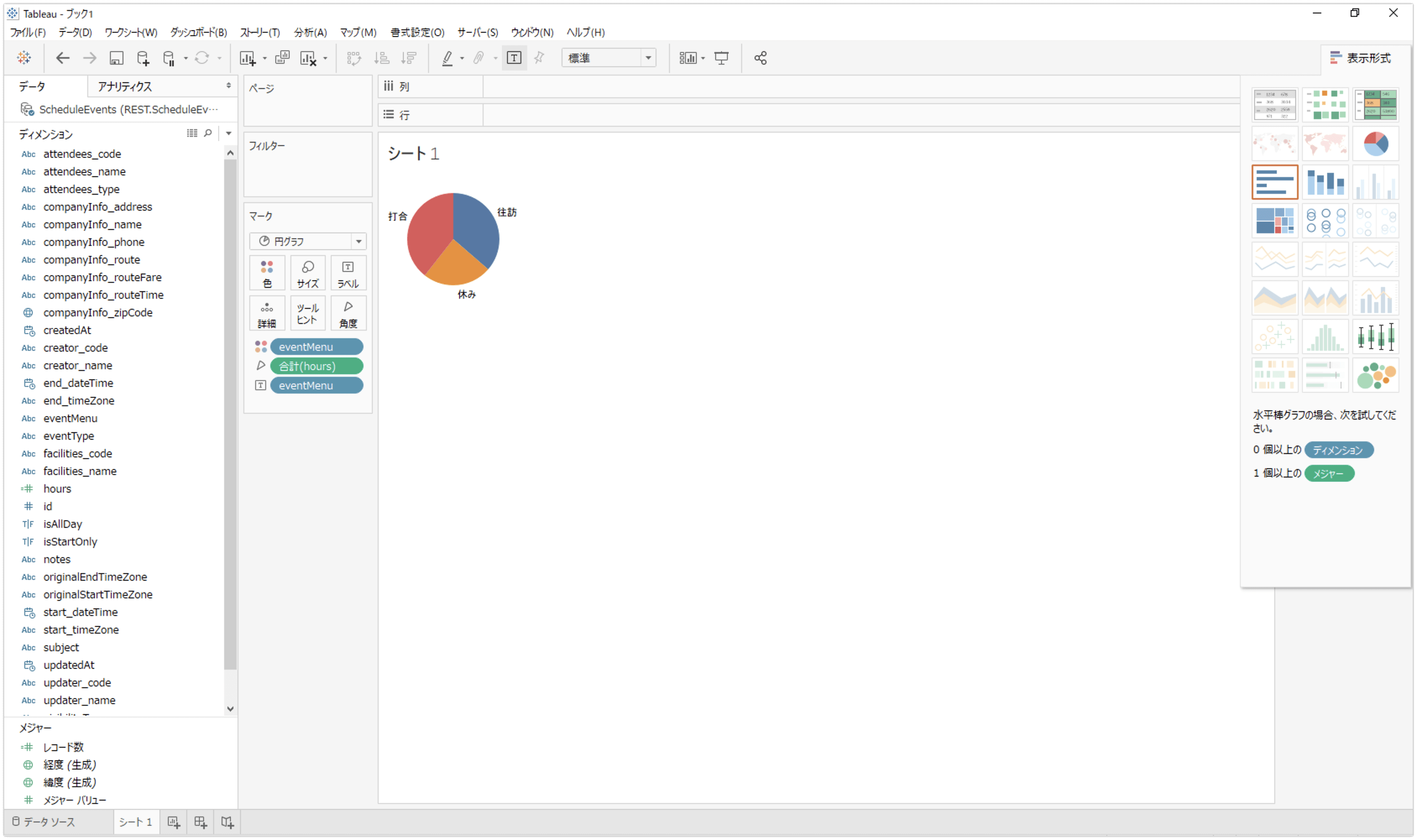 - 円グラフ : 軸:eventMenu、メジャー:数式(Sum(end_dateTime - start_dateTime))