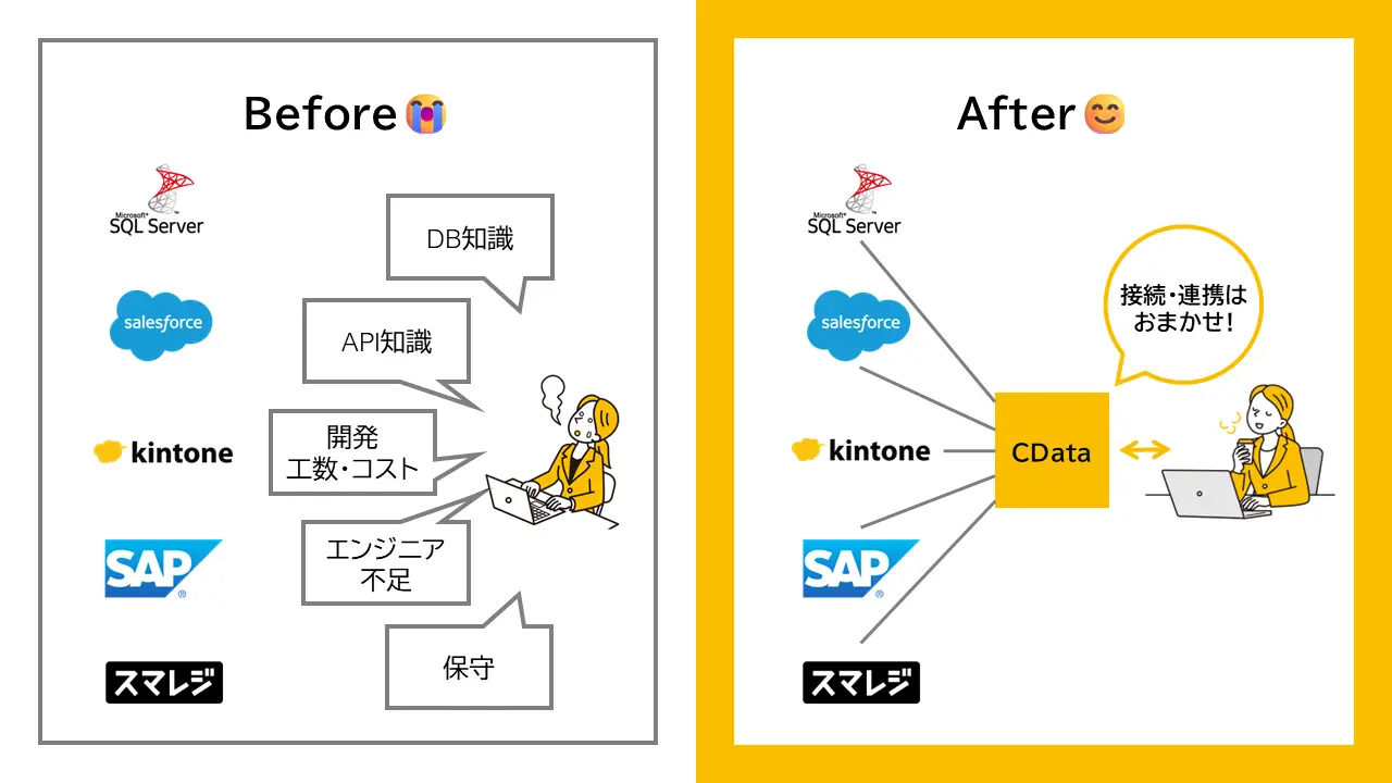 各システムの「方言」を、CData がまとめて通訳する。その結果として、「コネクティビティ(データのつながり)」が生まれます。