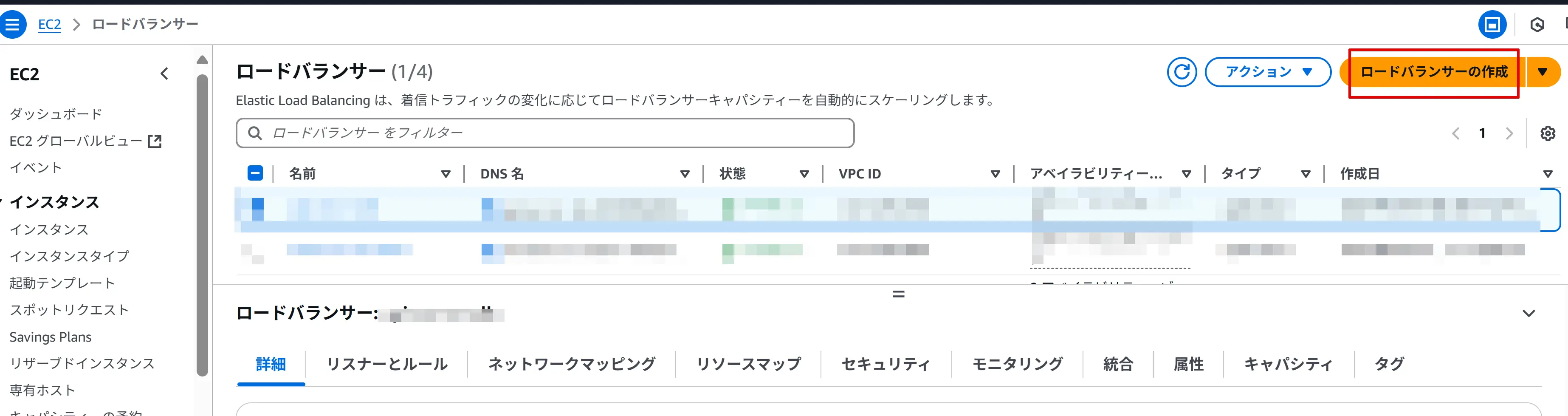 ロードバランサーの管理画面を開き、作成ボタンをクリックします。