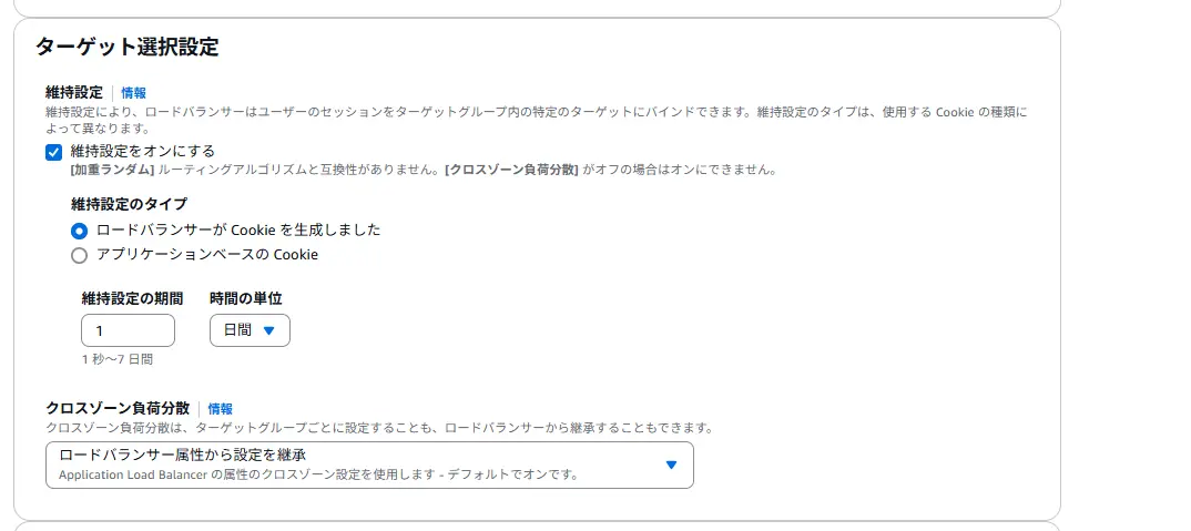 ターゲット選択設定の維持設定をオン、タイプは「ロードバランサーがCookie を生成しました」を選択します。