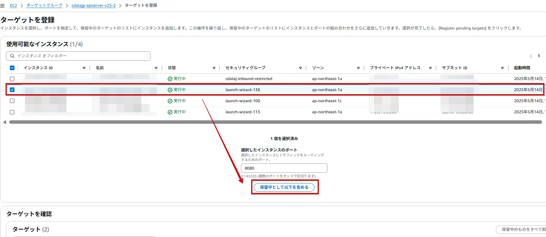 あとはターゲットとなるインスタンスを登録します。選択したインスタンスのポートも8080 に変更しておきます。