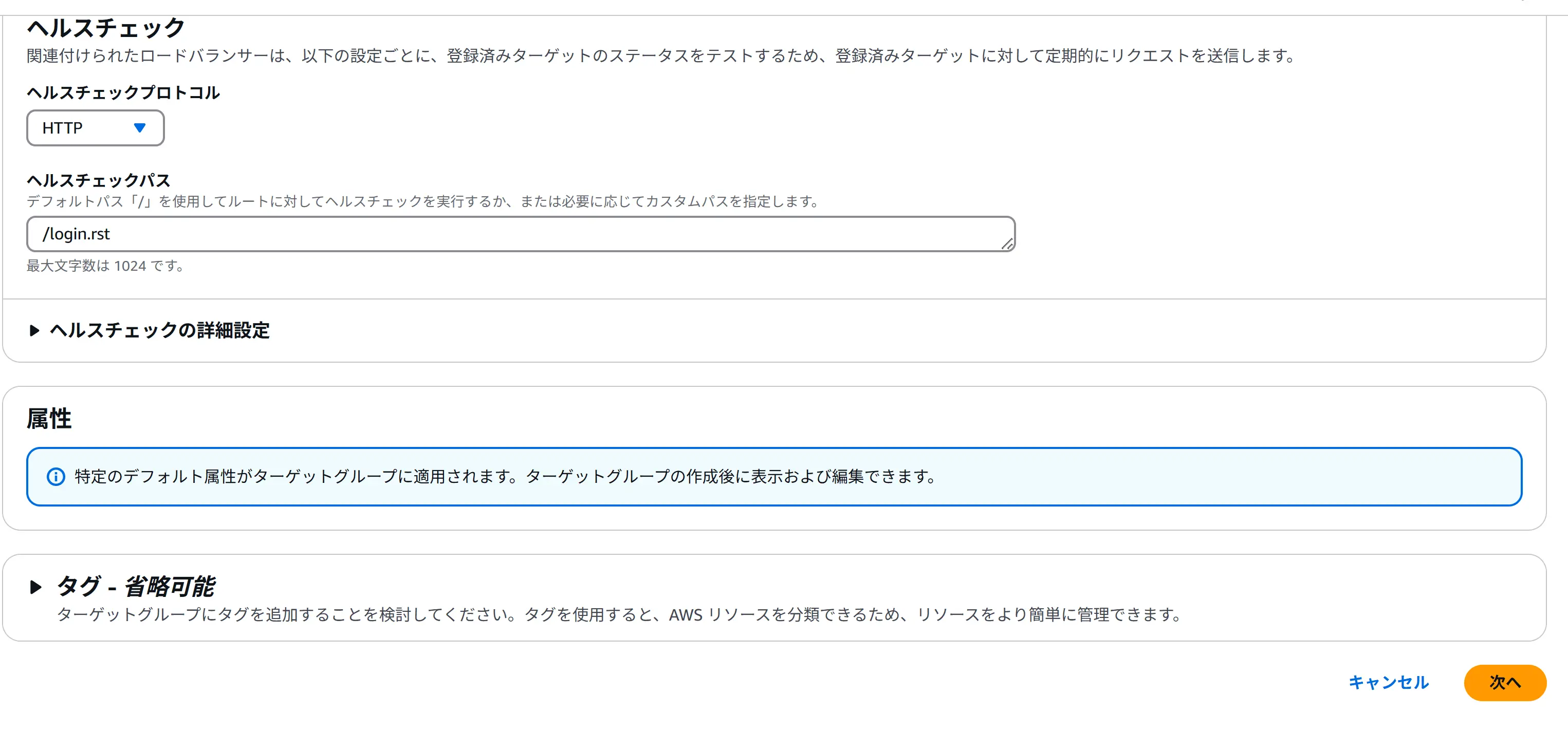 ヘルスチェックパスは「/login.rst」を指定しておきます。