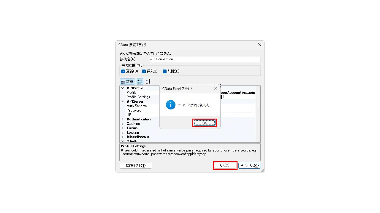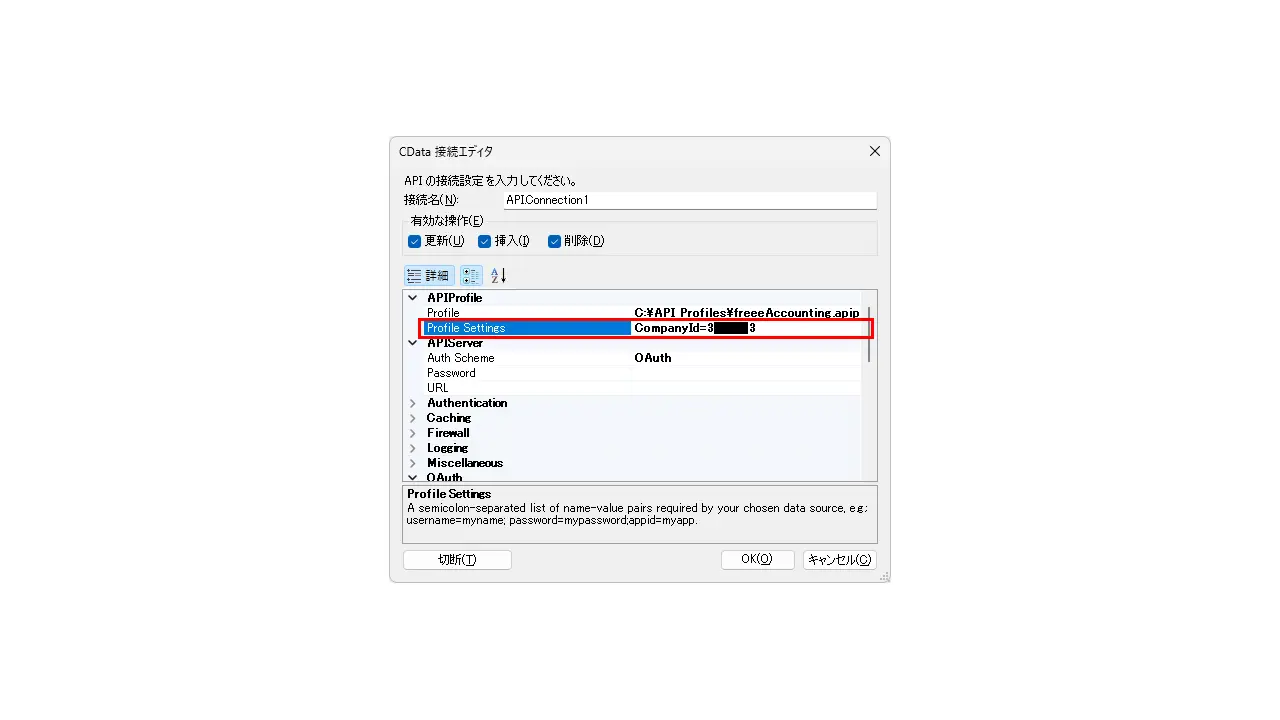 6.[Profile]に3で保存(移動)したAPI Profileのフルパス(例:C:\API Profiles\freeeAccounting.apip)を入力します。