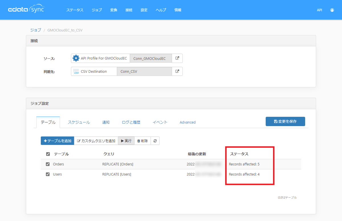 試しに手動で実行してみると、それぞれのレプリケーション件数が結果として表示されます。