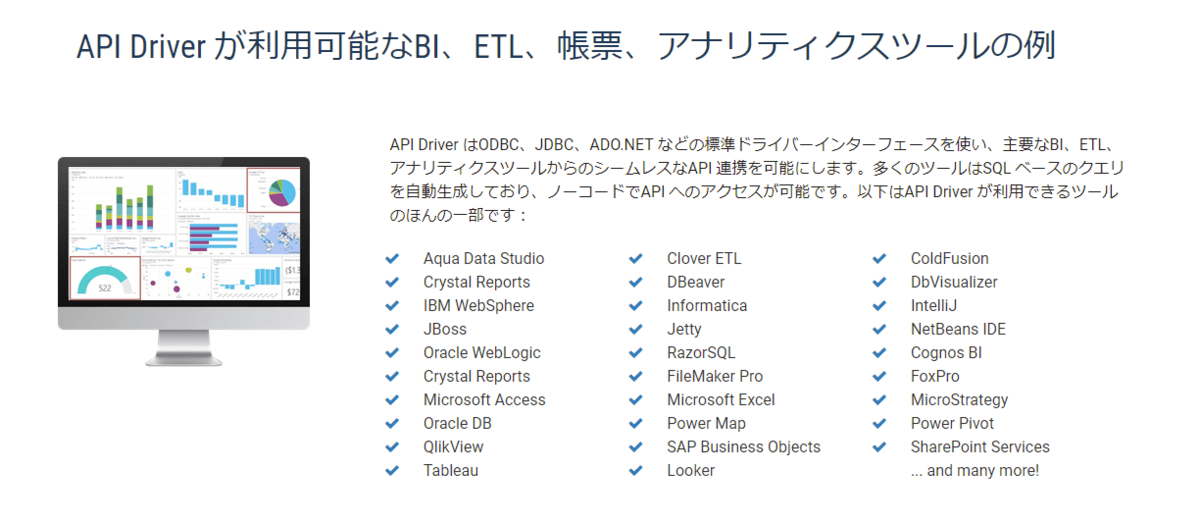 なお、CData API Driver は上記以外にも様々なツールと連携することが可能です。