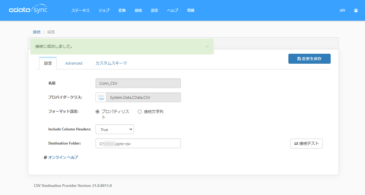 併せて、任意の同期先の接続情報も構成しておきましょう。この記事では同期先は手軽にCSV で構成しました。