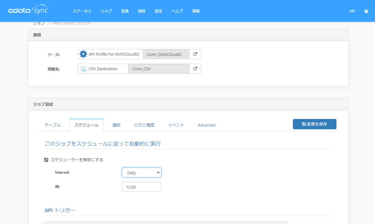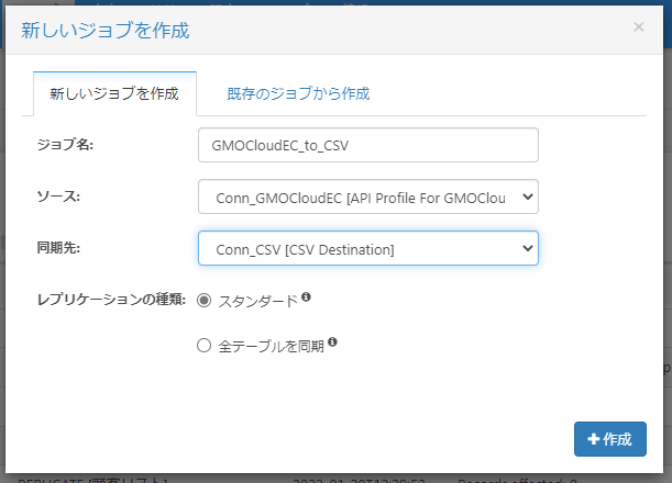 接続完了後、新しくジョブを作成します。ソースには先ほど作成したクラウドECプランのコネクションを。同期先には同じく先ほど作成したCSV のコネクションを選択します。