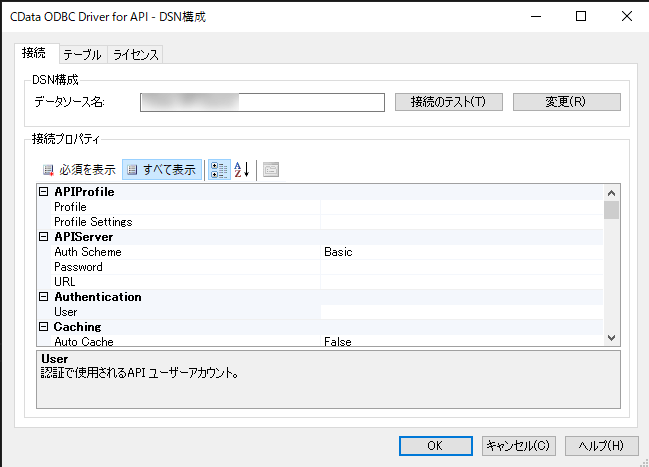 最初に接続するためのウィザードが表示されるので、「CData API Driver のインストール」の内容と同様に各種パラメータを入力します。
