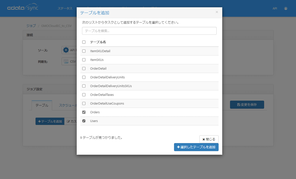 ジョブを作成した後は、クラウドECプランの同期対象となる任意のテーブルを選択しましょう。この記事では Users とOrders を選択しました。