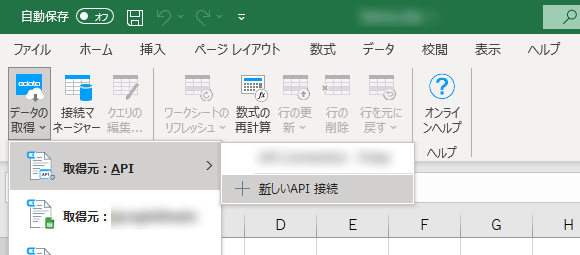 接続を開始するには、CDataタブから[取得元 API]- [新しいAPI 接続] をクリックします。