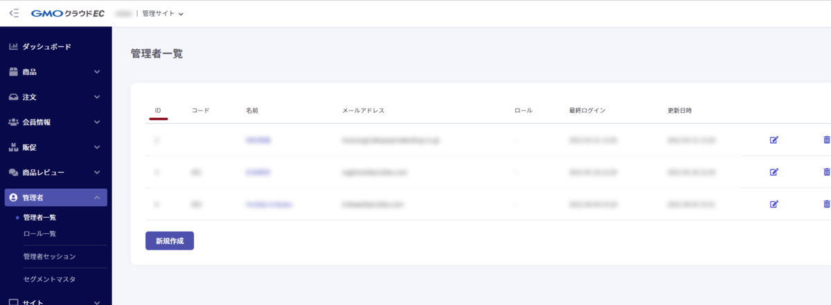 管理者一覧から、"API 専用の管理者" を登録します。管理者の登録が完了すると、管理者ID の払い出しがおこなわれます。この管理者ID が管理API のリクエスト時に用いるmanager_id となります。