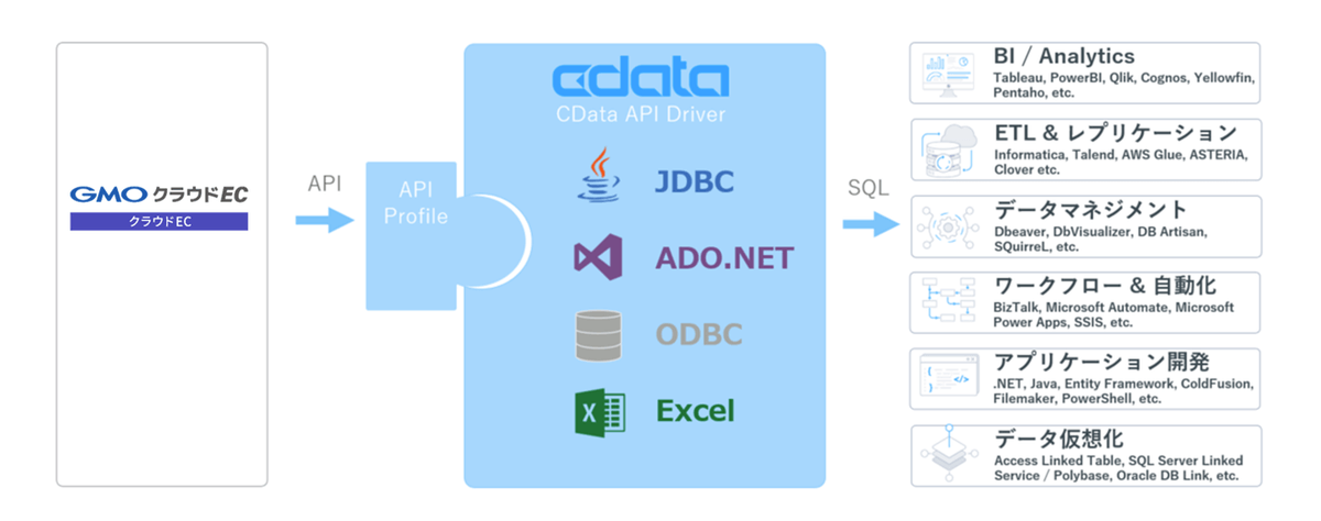 これにより、それぞれのツールからはODBC / JDBC / ADO.NET といった標準のDB 接続規格を利用してクラウドECプランのAPI へ接続し、SQL でデータを取得することが可能になります。
