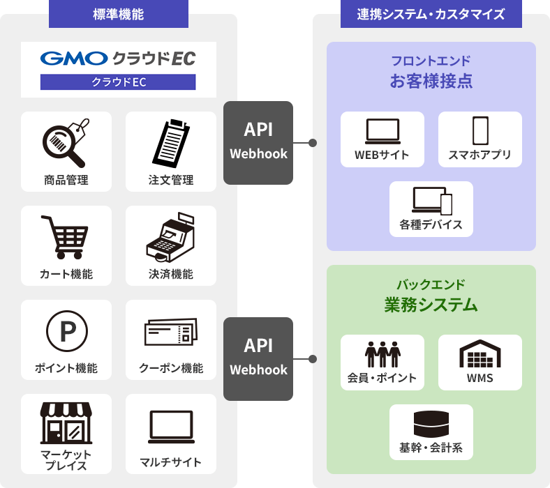 クラウドECプランでは、売り場機能やカート機能、注文系機能や会員系機能など、EC サイトのフロント側より、商品情報の検索、呼び出し、会員登録、カート投入、決済処理といったEC サイトのお客様が接する画面での様々なデータを司る「フロントAPI」と、会員や商品、注文など、EC サイトのバックエンド側の業務を遂行するための「管理API」が提供されています。