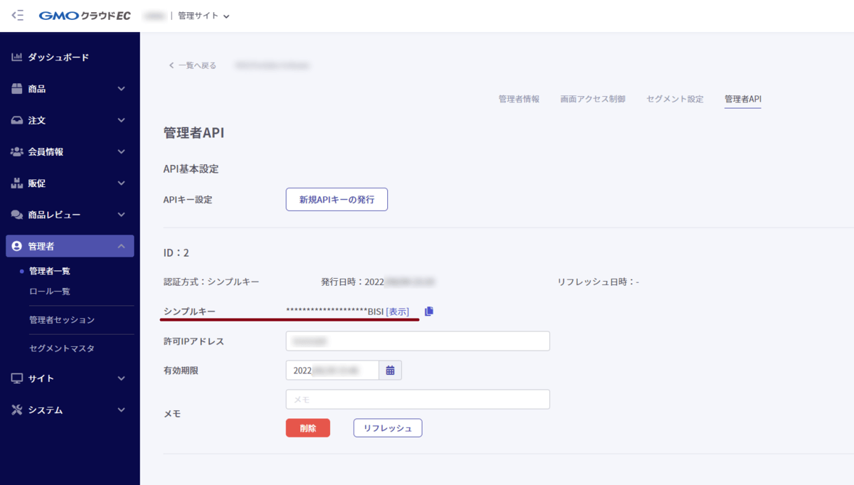 作成した管理者でAPI キーを発行します。提供されている認証方式にはシンプルキーとHMAC 方式がありますが、この記事の時点で、クラウドECプラン用のAPI Profile ではシンプルキーに対応しています。シンプルキー方式のAPI キーを発行して取得しておいてください。