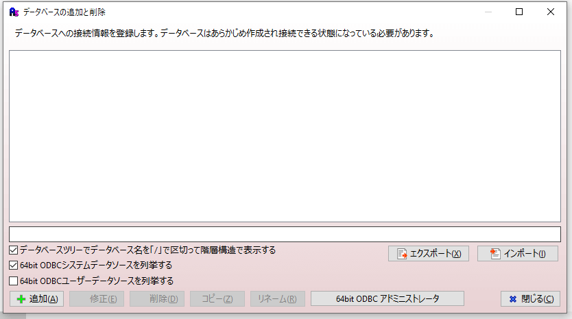 インストール後、A5:SQL Mk-2 を起動したら、データベースの追加と削除で接続情報を登録します。これまでに既にODBC データソースは構成していますので「ODBC システムデータソースを列挙する」で簡単に接続してしまいます。