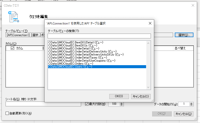 接続後、対象テーブルを選択し「OK」をクリックします。