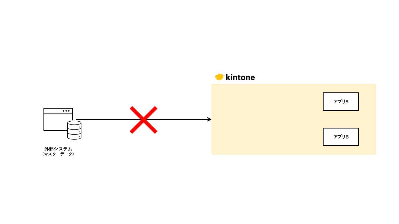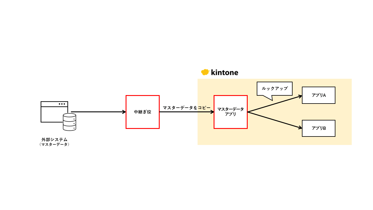 間に外部システムとの「中継ぎ役」と外部システムから持ってきた「マスターデータ保存用のkintone アプリ(以下、マスターデータアプリ)」の2つを挟む必要があります。