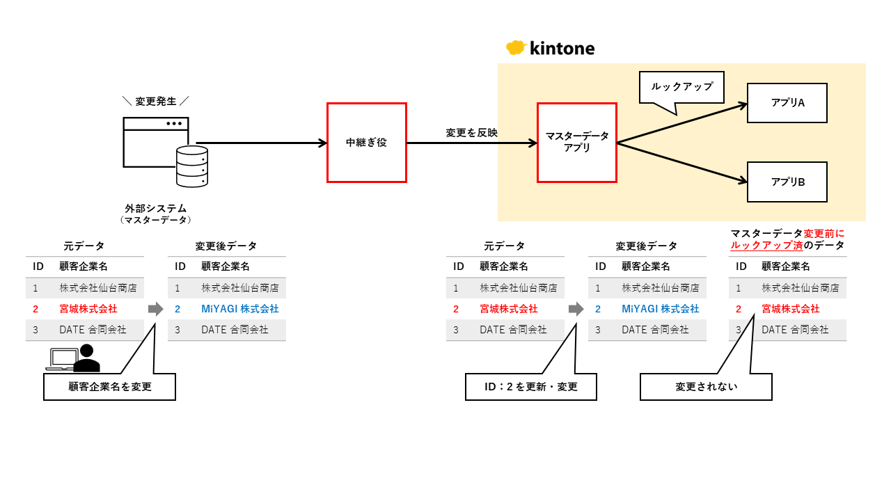 外部システム側のマスターデータに追加・変更があった場合でも、外部システムとマスターデータアプリ間で定期的にデータを同期させておけば、最新のマスターデータをkintone アプリでルックアップ利用することが可能です。