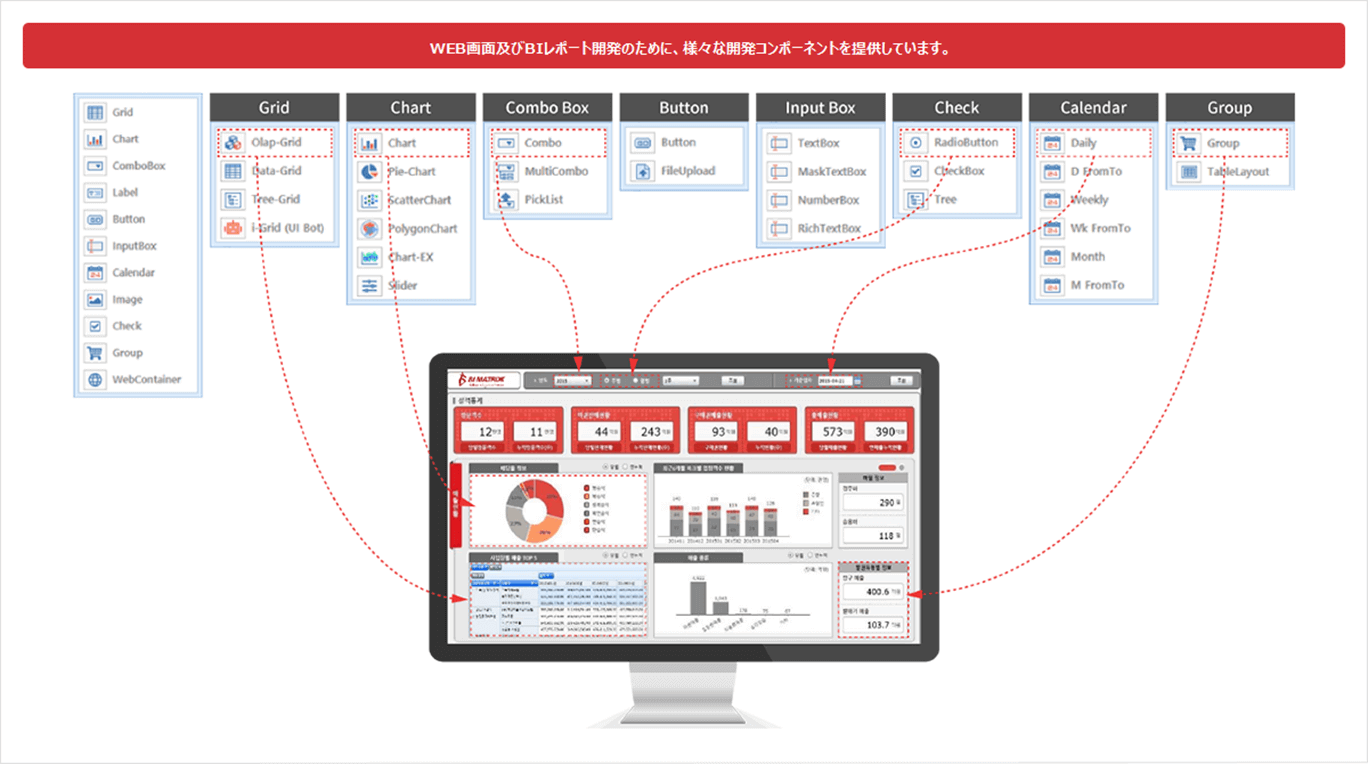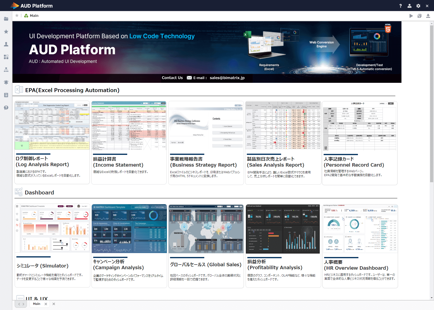 AUD Platform はBI Matrix 社が提供する、「BIツール」、「視覚化分析ツール」、「レポーティングツール」、「UI/UXツール」、そして「JSP/Java開発」で行った様々な業務を一つの製品で統合した、統合UI 開発プラットフォームです。