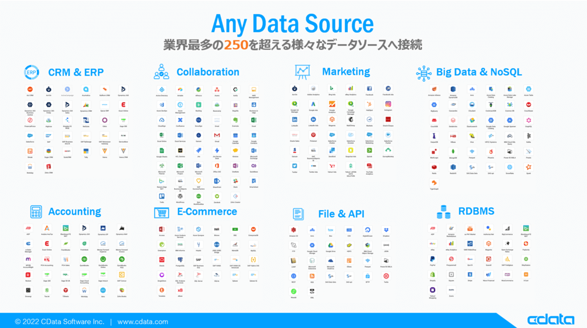 CData では Salesforce 以外にもJDBC Driver を多数提供しています。kintone や HubSpot、Sansanなど様々なデータソースをサポートしているので、ぜひ自社で使っているクラウドサービスやNoSQL と合わせて活用してみてください。