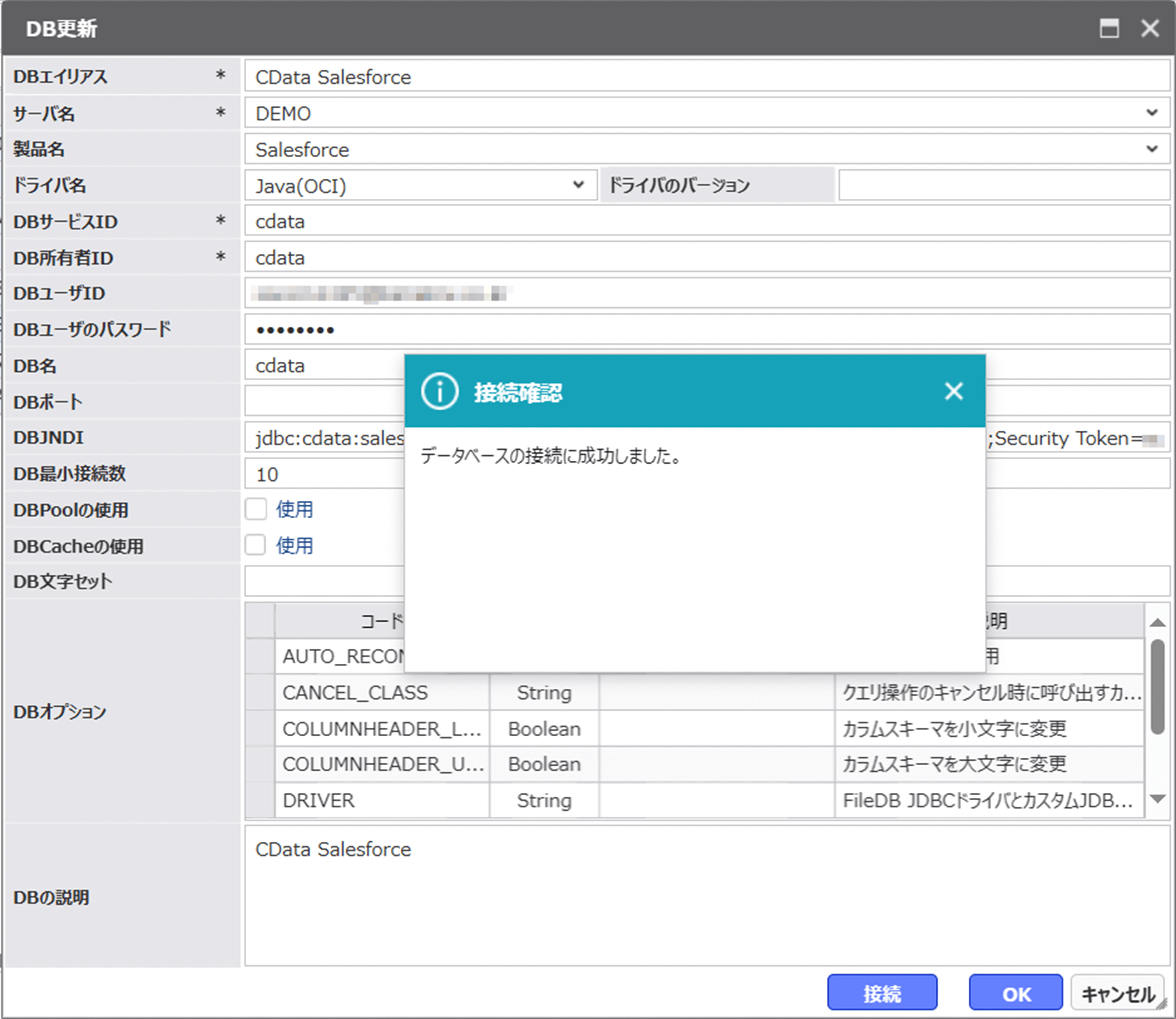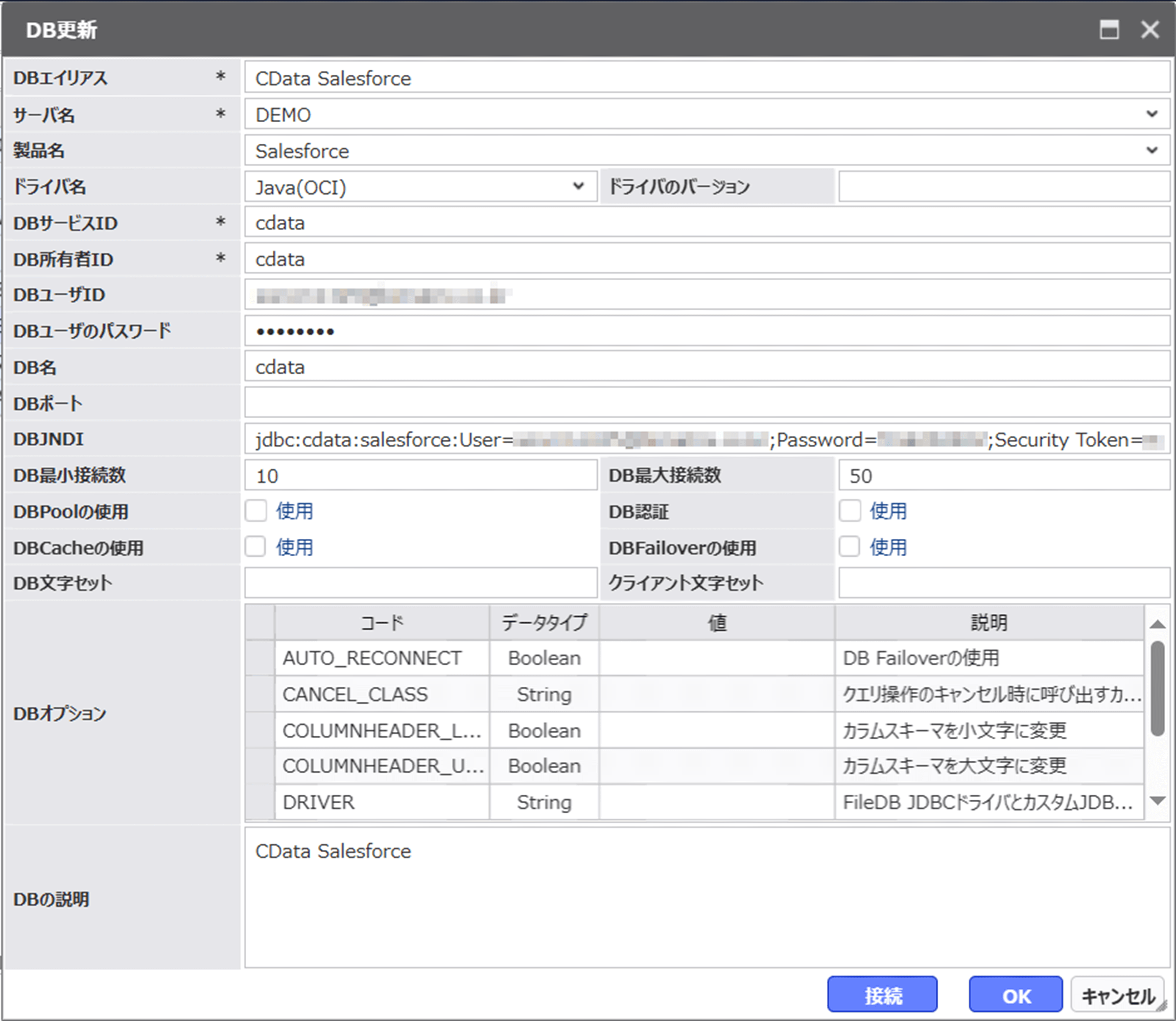 ドライバ名では「Java(OCI)」を選択し、DB JNDI に先ほど接続テストツールで確認した接続文字列を入力します。
