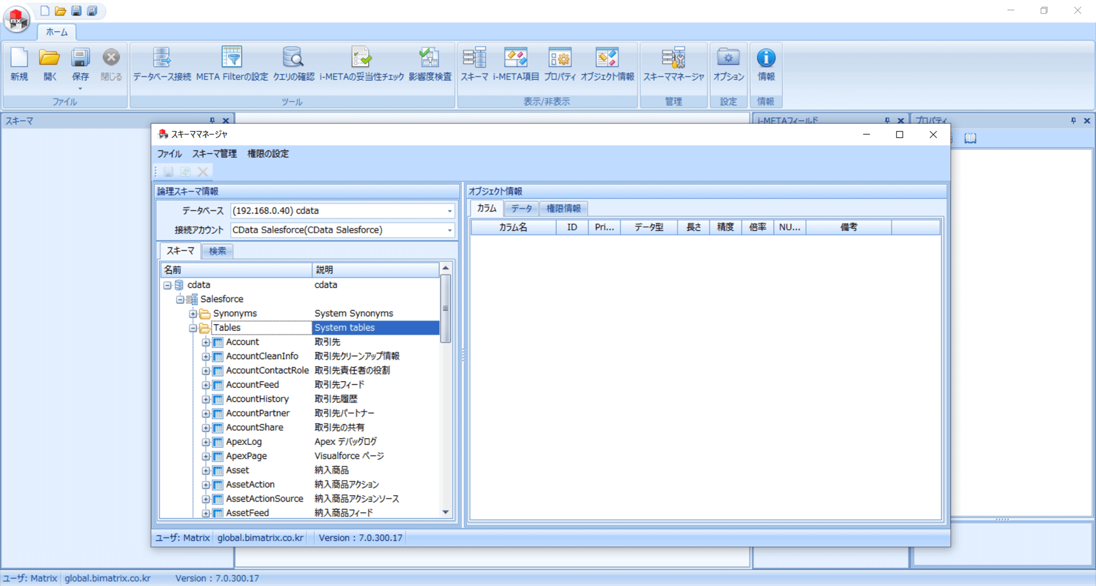 データソース接続情報を作成後、AUD Platform のi-META Designer > スキーママネージャで接続済みのCData データソース情報を更新します。