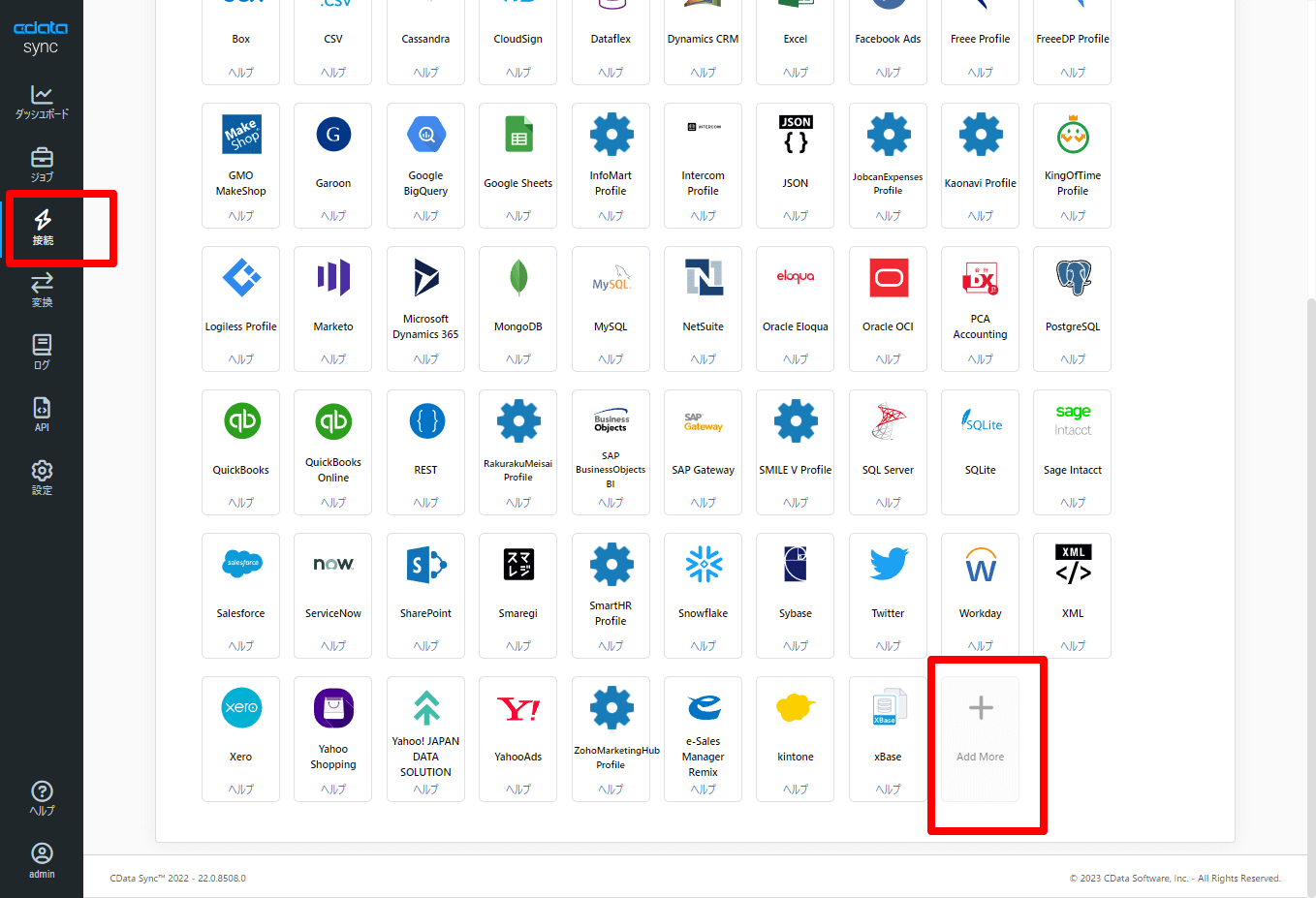 デフォルトでは Bcart データソースが含まれていないため、「接続」に移動し「+ Add More」をクリックし、追加を行います。