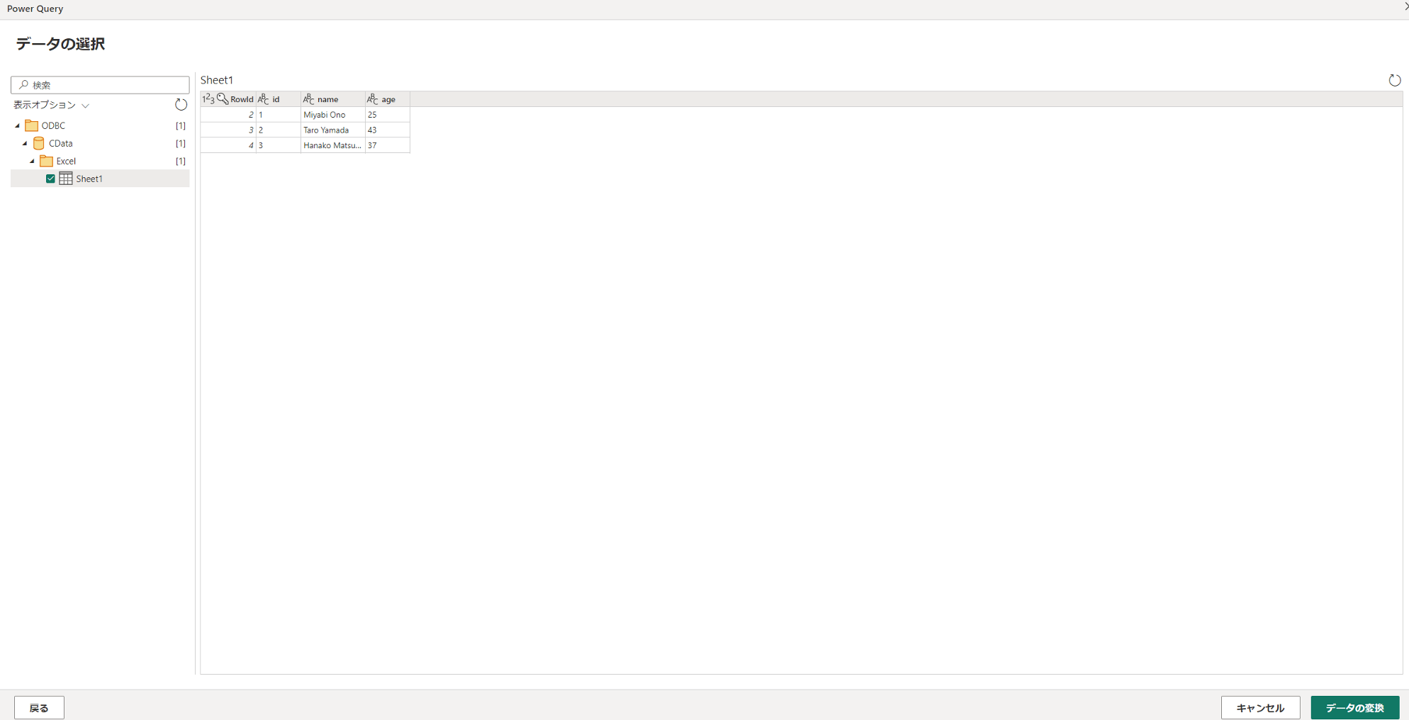 「PowerQuery - データの選択」画面に切り替わります。左側のエクスプローラで「ODBC > CData > Excel」フォルダを開くとCData Excel Power BI Connector で接続しているBox 内のExcel におけるテーブルリストが表示されます。