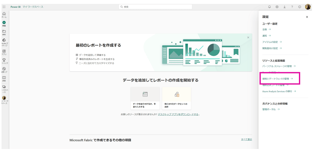 次に、Power BI サービスで「設定」→「接続とゲートウェイの管理」をクリックします。