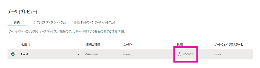 データソースが追加されたら、状態の更新アイコンをクリックし「オンライン」と表示されれば設定完了となります。