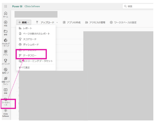 左タブのワークスペースを開き、「+新規 > データフロー 」を開きます。