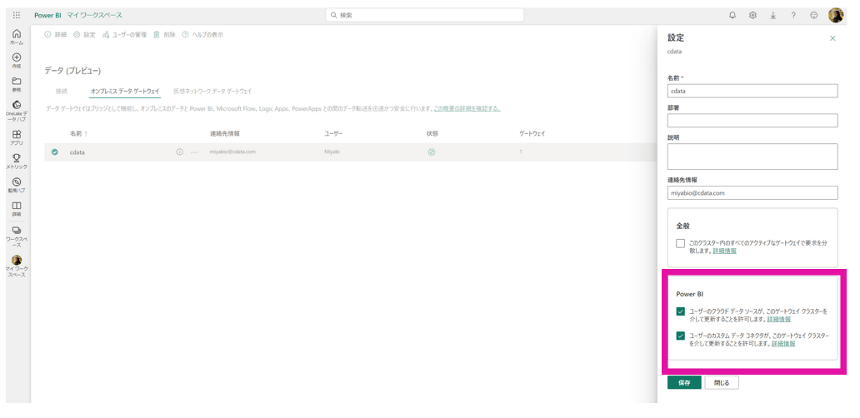 「ユーザーのクラウドデータソースが、このゲートウェイクラスターを介して更新することを許可します。」と、「ユーザーのカスタムデータコネクタが、このゲートウェイクラスターを介して更新することを許可します。」にチェックを入れ、「保存」をクリックします。