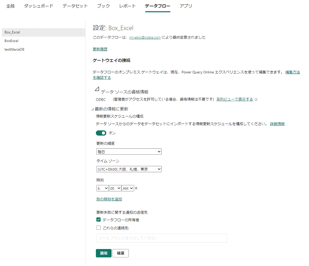上記画面のデータフロー「Box_Excel」から「更新のスケジュール設定」>「ゲートウェイの接続」>「最新の情報に更新」の順にボタンをクリックします。