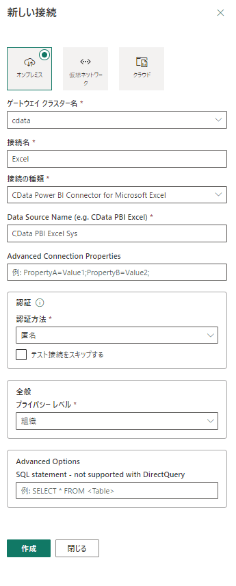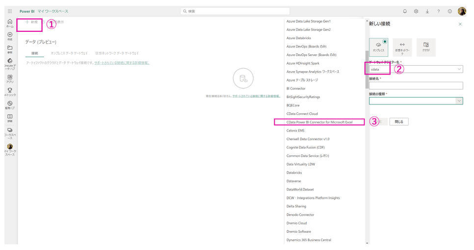 上記の設定を行い、オンプレミスゲートウェイと接続された状態で「+新規」をクリックすると、ゲートウェイクラスター名でオンプレミスゲートウェイが選択できるようになります。接続の種類では「CData Power BI Connector for Microsoft Excel」を選択してください。
