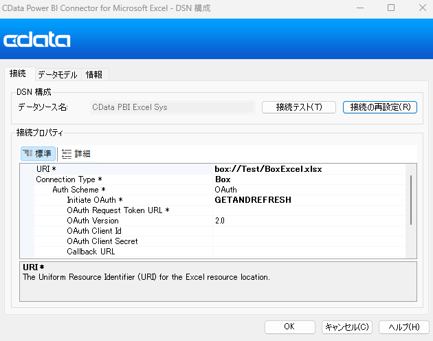 接続設定の画面が表示されるので「URI」の項目にBox上の対象ファイルを指定します。「box://」に続けて、フォルダパスとファイル名まで指定してください。