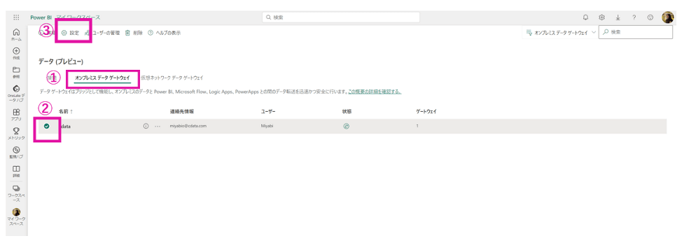 ・オンプレミスデータゲートウェイ:既に作成したゲートウェイを選択します