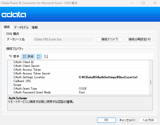 そして、下記のように「OAuth Settings Location」で認証情報の保存先ファイルパスを指定いただいた後、「接続テスト(T)」をクリックして認証を行います。