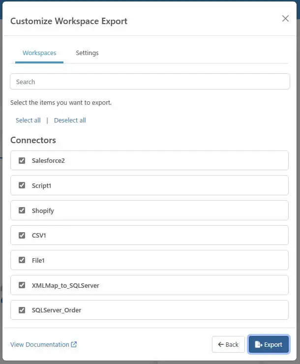 これまでのCData Arc でも、フローデザイナーからワークスペースやフロー・コネクタの単位でエクスポートしたり、エクスポートしたフローをインポートしたりすることができましたが、今回のアップデートでこの機能が大きく改善・強化されました。