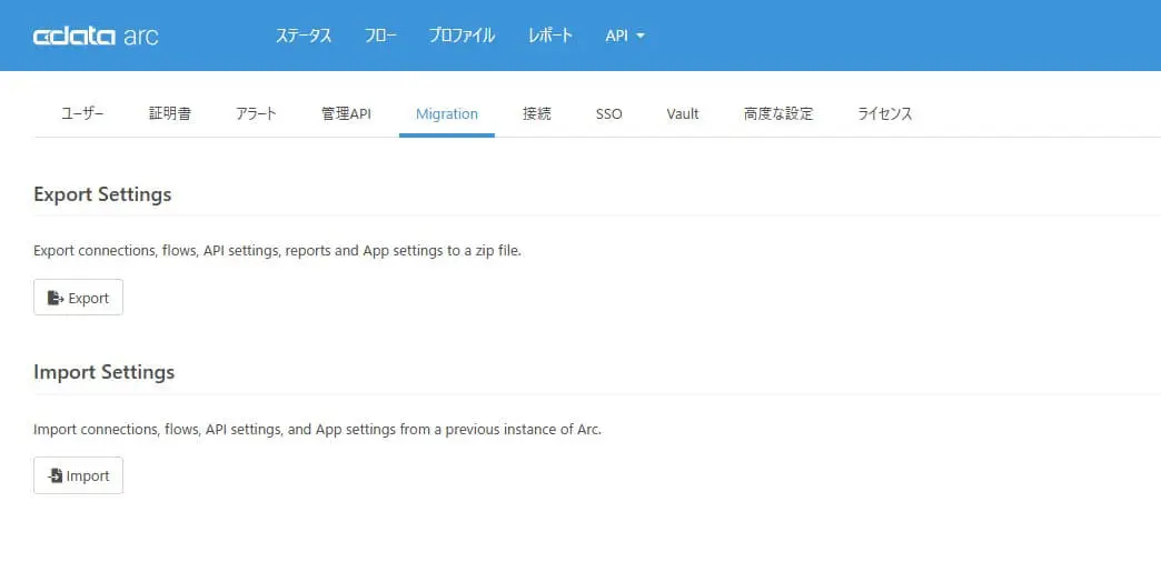 テンプレートフローのインポートや、作成したフローのバックアップや別のCData Arc 環境に移行のためのエクスポートなど、フローのエクスポート・インポートはよく利用される機能です。