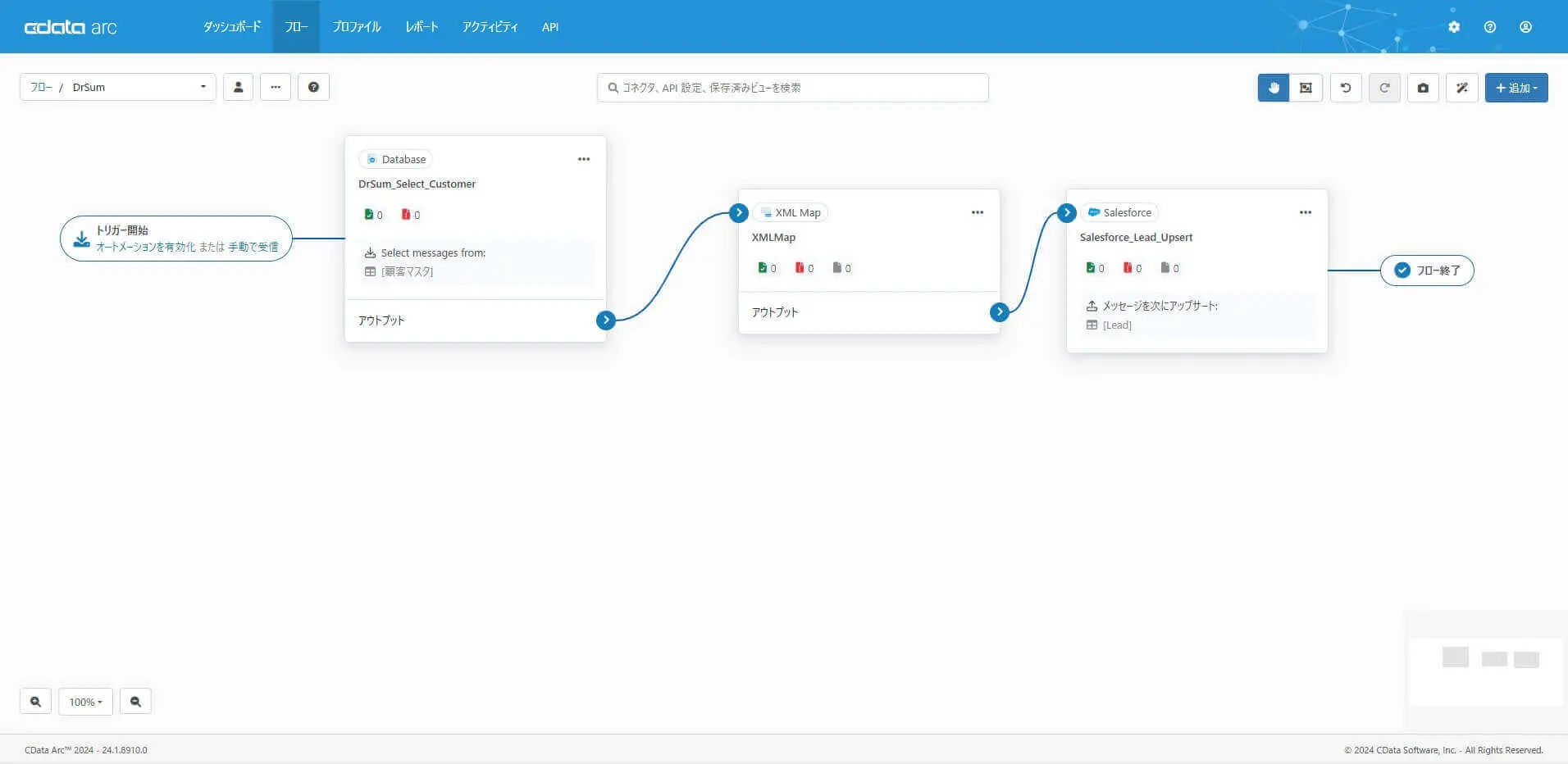 これでDr.Sum Server からデータ取得するコネクタの構成は完了です。この後のデータを連携したいアプリケーションへのフローは、それぞれのシナリオにあわせて構成してみてください。以下はDr.Sum Server のデータをSalesforce に連携する(フィードバックする)フローです。このようなフローの作成ステップはこちらの記事などが参考にして頂けると思います。