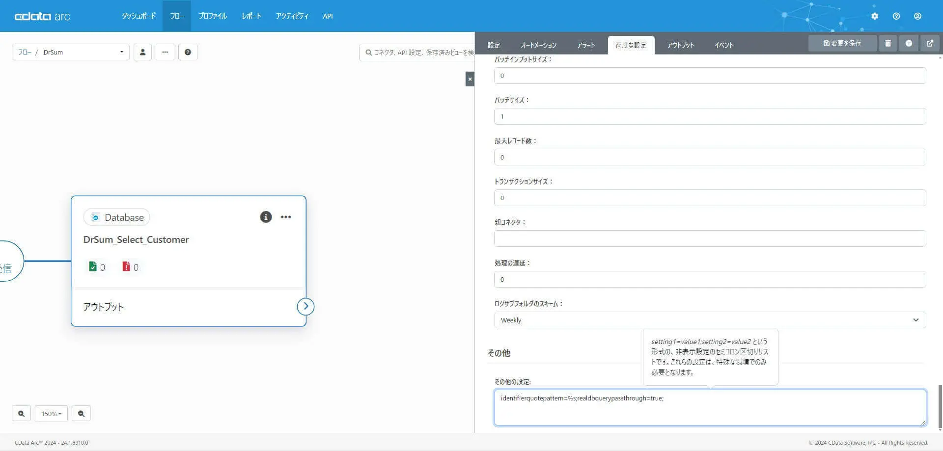 Database コネクタは接続先を特定しない汎用目的のコネクタのため、Dr.Sum Server が許容する構文でクエリ発行するために、一部調整が必要です。「高度な設定」の「その他の設定」に下記のように指定します。