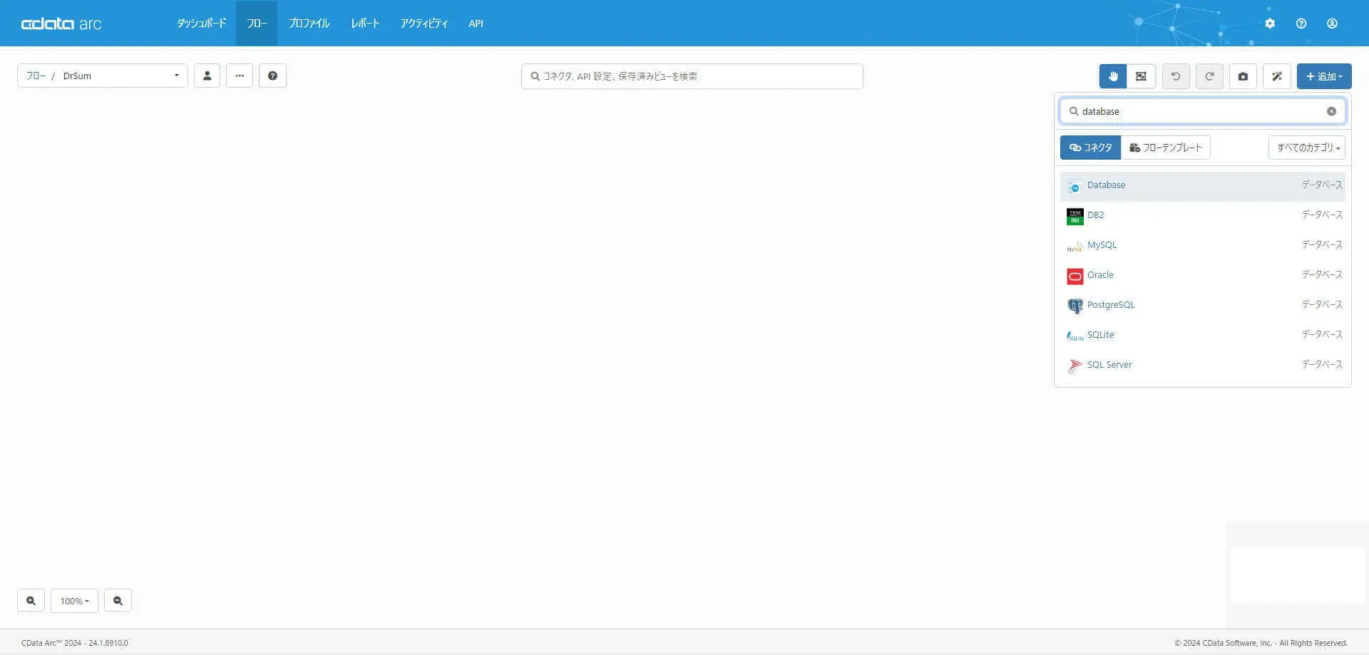 Database コネクタでの具体的な設定が、この記事のポイントです。まずDr.Sum Server からデータ取得するDatabase コネクタを作成します。