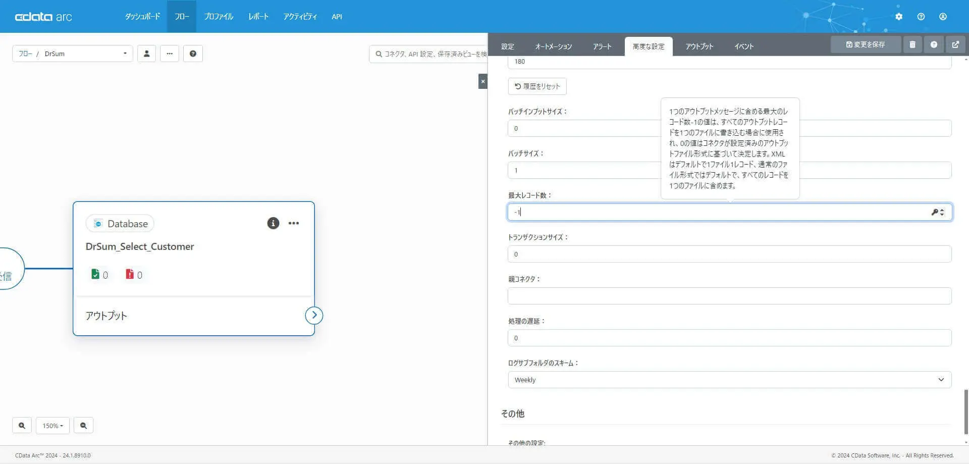加えて、この記事では「取得したデータを1つのアウトプットファイルにまとめる」ために「最大レコード数」を「-1」に指定しました。最大レコード数の設定は連携するシナリオにあわせて調整してください。