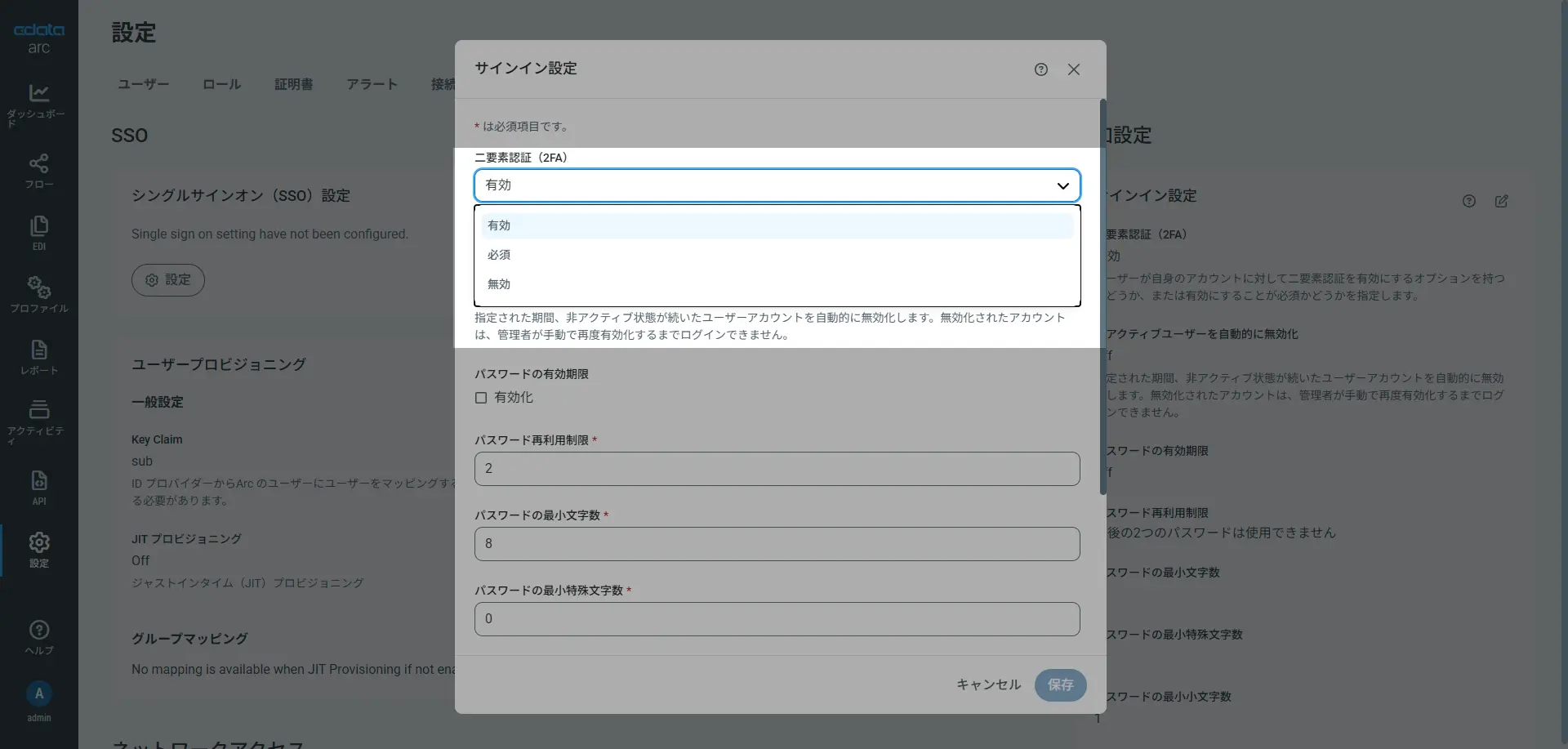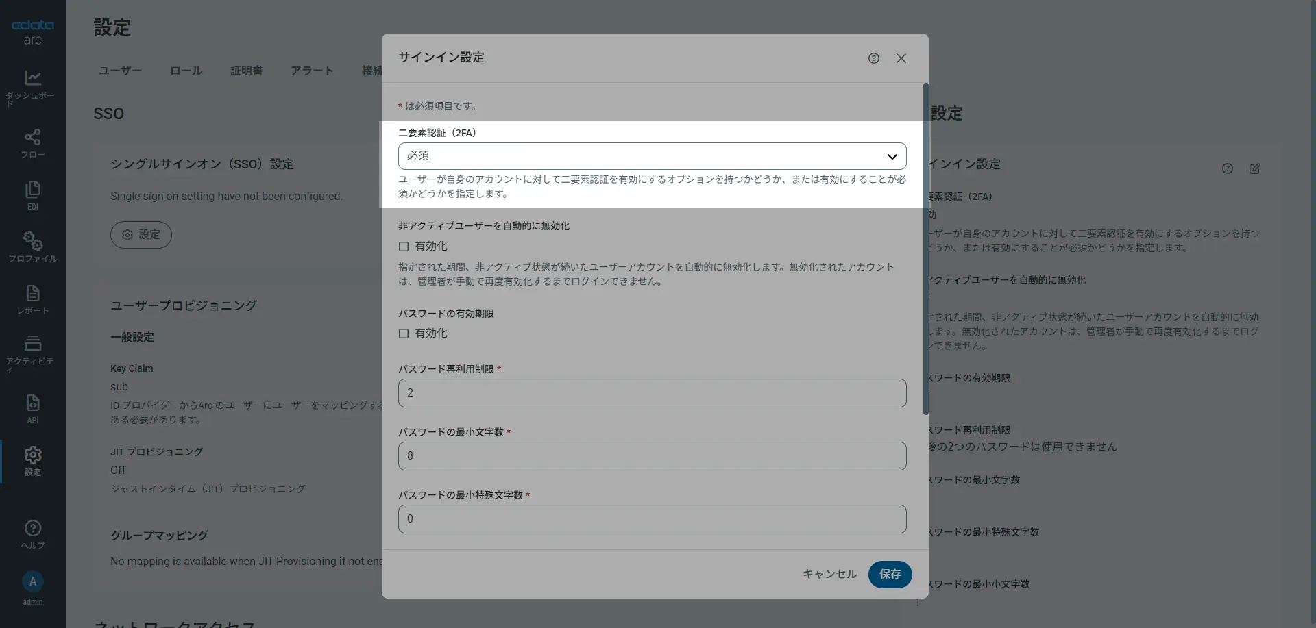 Arc では、組織のセキュリティポリシーへの準拠が必要なエンタープライズでの利用シーンに向けて、アカウントのセキュルティポリシーを管理できるサインイン設定を提供しており、アカウントログイン時の追加保護としてArc ネイティブの二要素認証(2FA)もサポ-トしています。サインイン設定ではパスワードの有効期限やパスワードルール、非アクティブなアカウントの扱いなどとともに、二要素認証(2FA)について利用を有効とするか、必須とするか(または無効とするか)をコントロールすることができます。